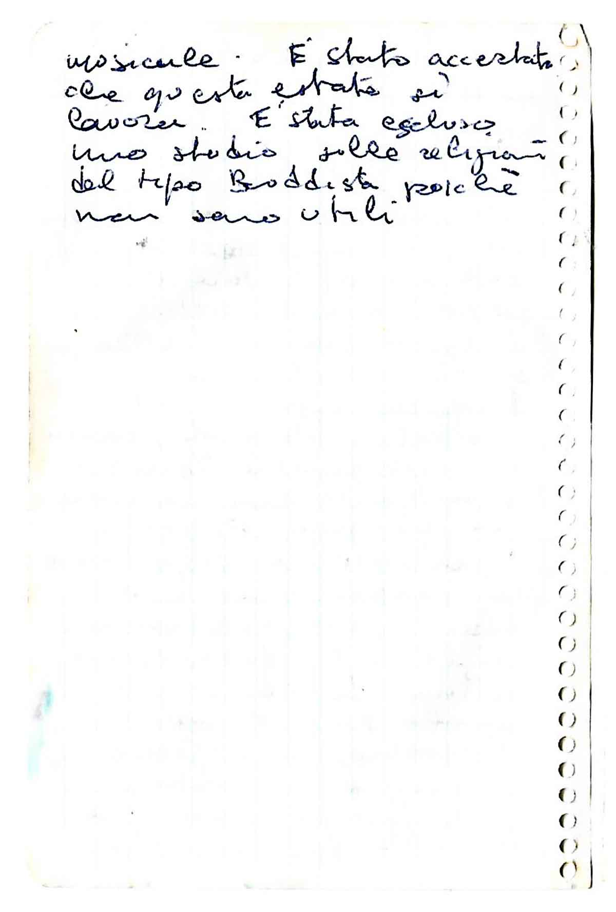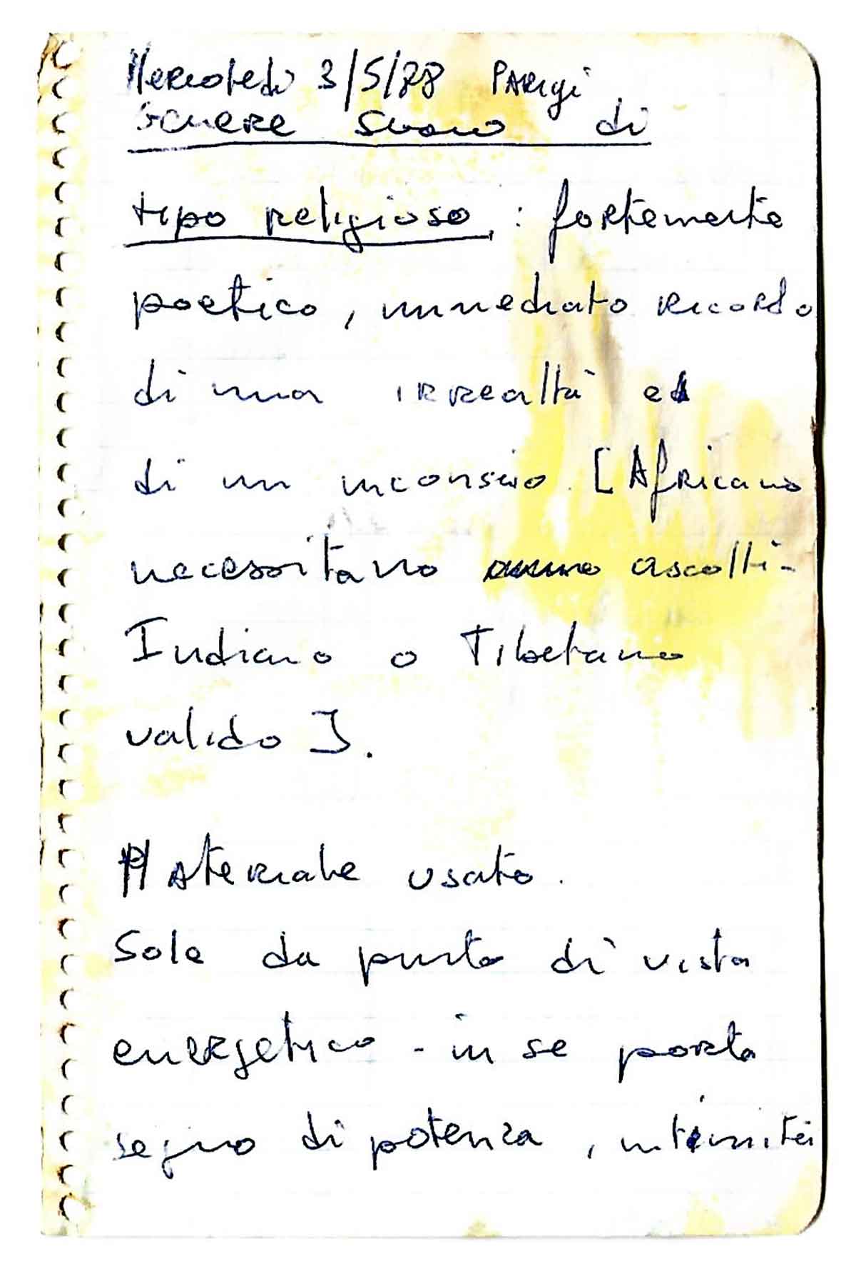 Genere di suono di tipo religioso: fortemente poetico, immediato ricordo di una irrealtà e di un inconscio (Africano necessitano ascolti Indiano o Tibetano valido). Materiale usato sole dal punto di vista energetico – in sé porta segno di potenza, intimità (poiché una cosa a noi nota) luce – calore – bellezza.