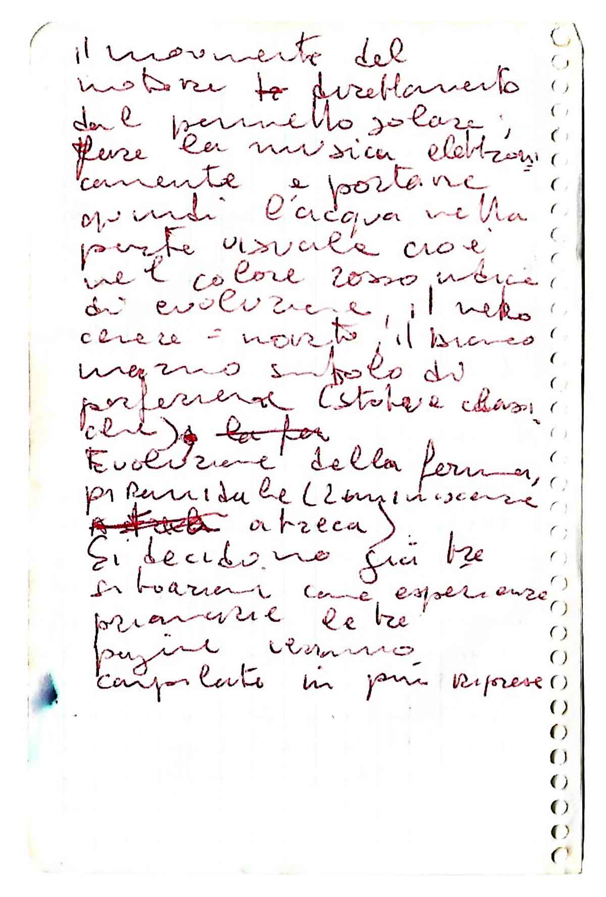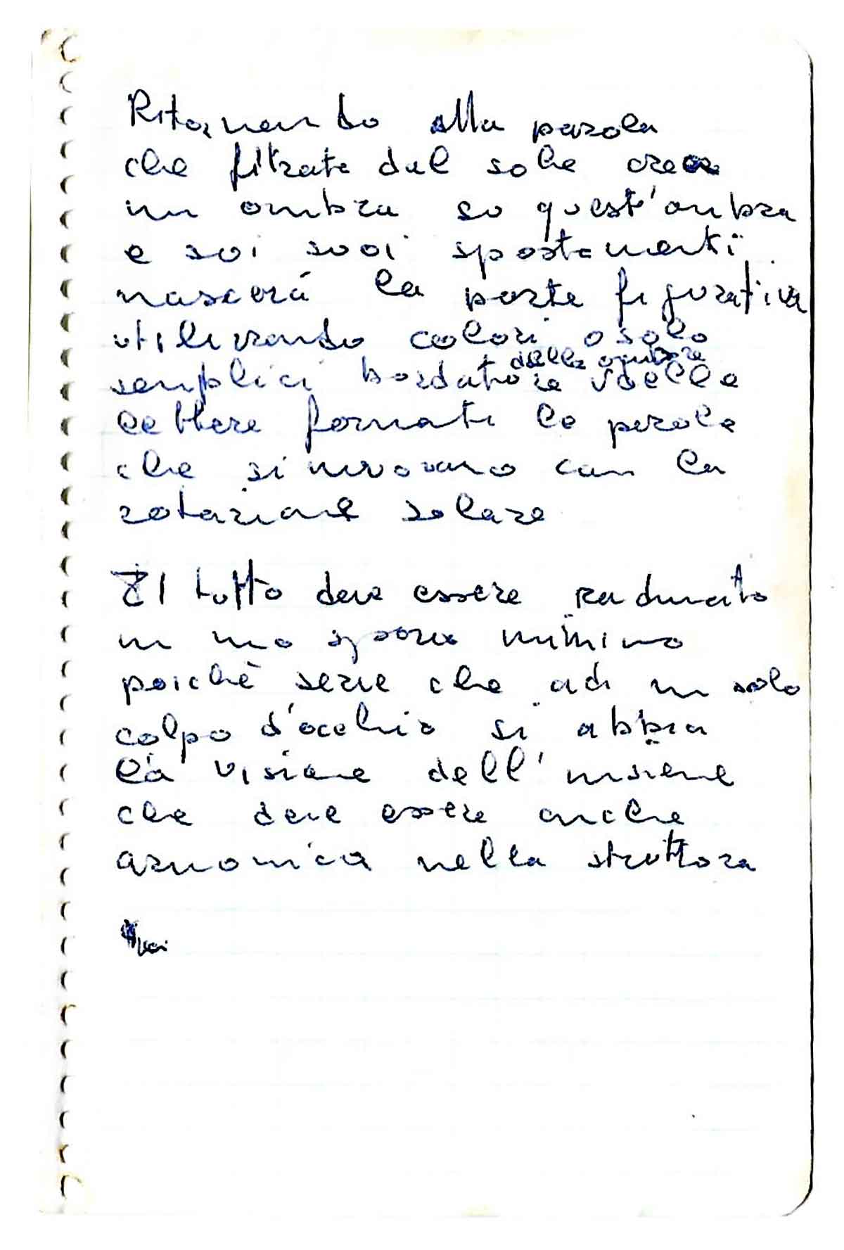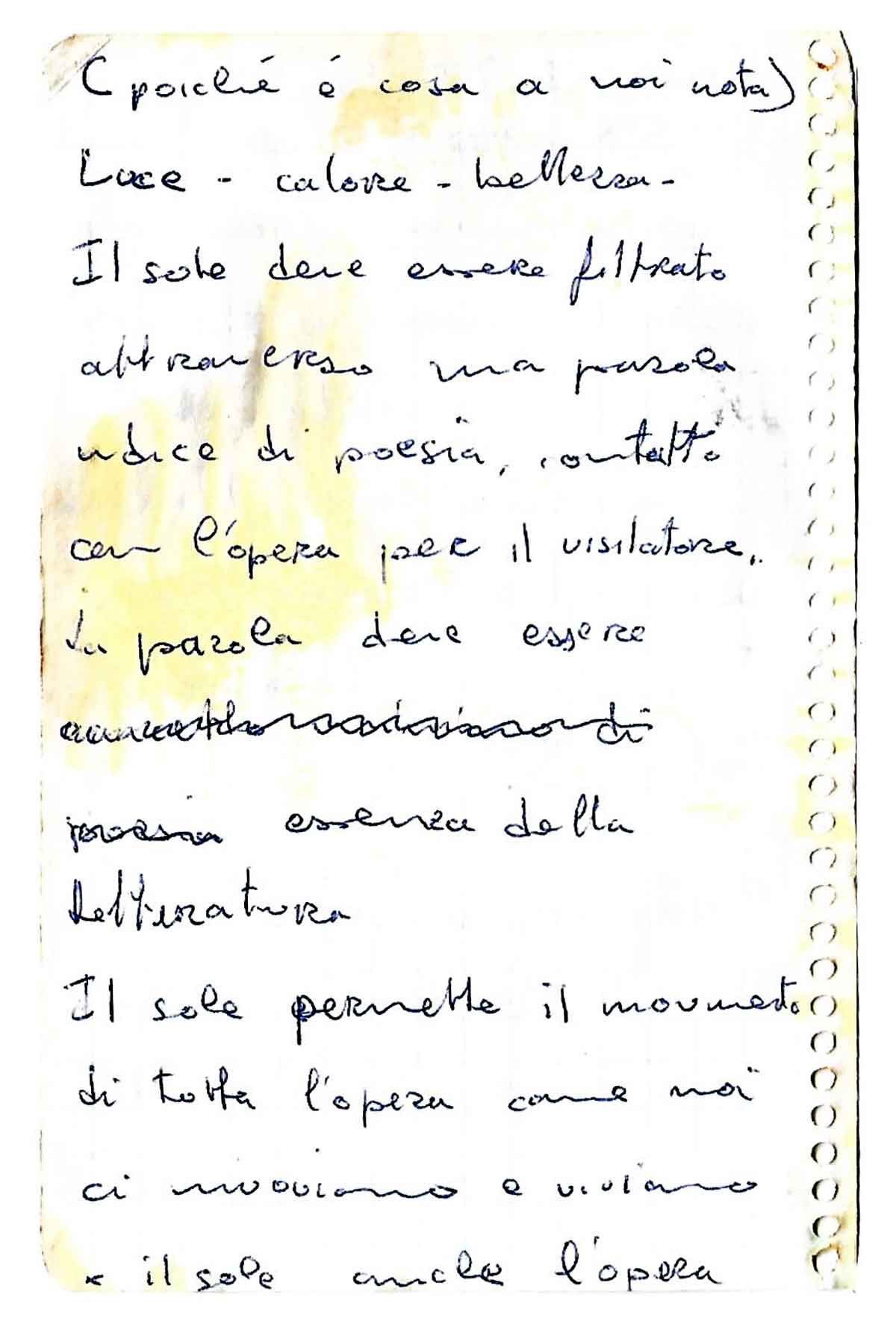 Il sole deve essere filtrato attraverso una parola indice di poesia, contatto con l’opera per il visitatore. La parola deve essere essenza della letteratura. Il sole permette il movimento di tutta l’opera come noi ci muoviamo e viviamo per il sole anche l’opera vive solo con esso.