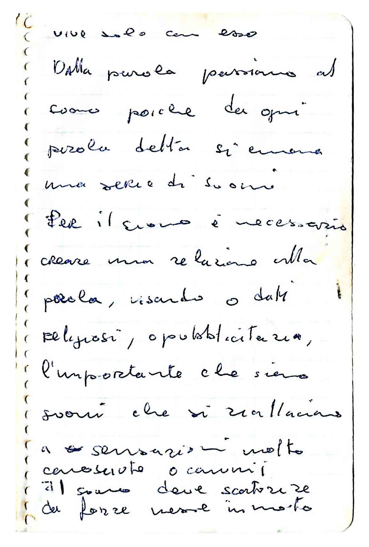 Dalla parola Passiamo al suono poiché ad ogni parola detta si emana una serie di suoni. Per il suono è necessario creare un una relazione alla parola, usando o dati religiosi, o pubblicitari, l’importante è che siano suoni che si riallacciano a sensazioni molto conosciute o comuni.