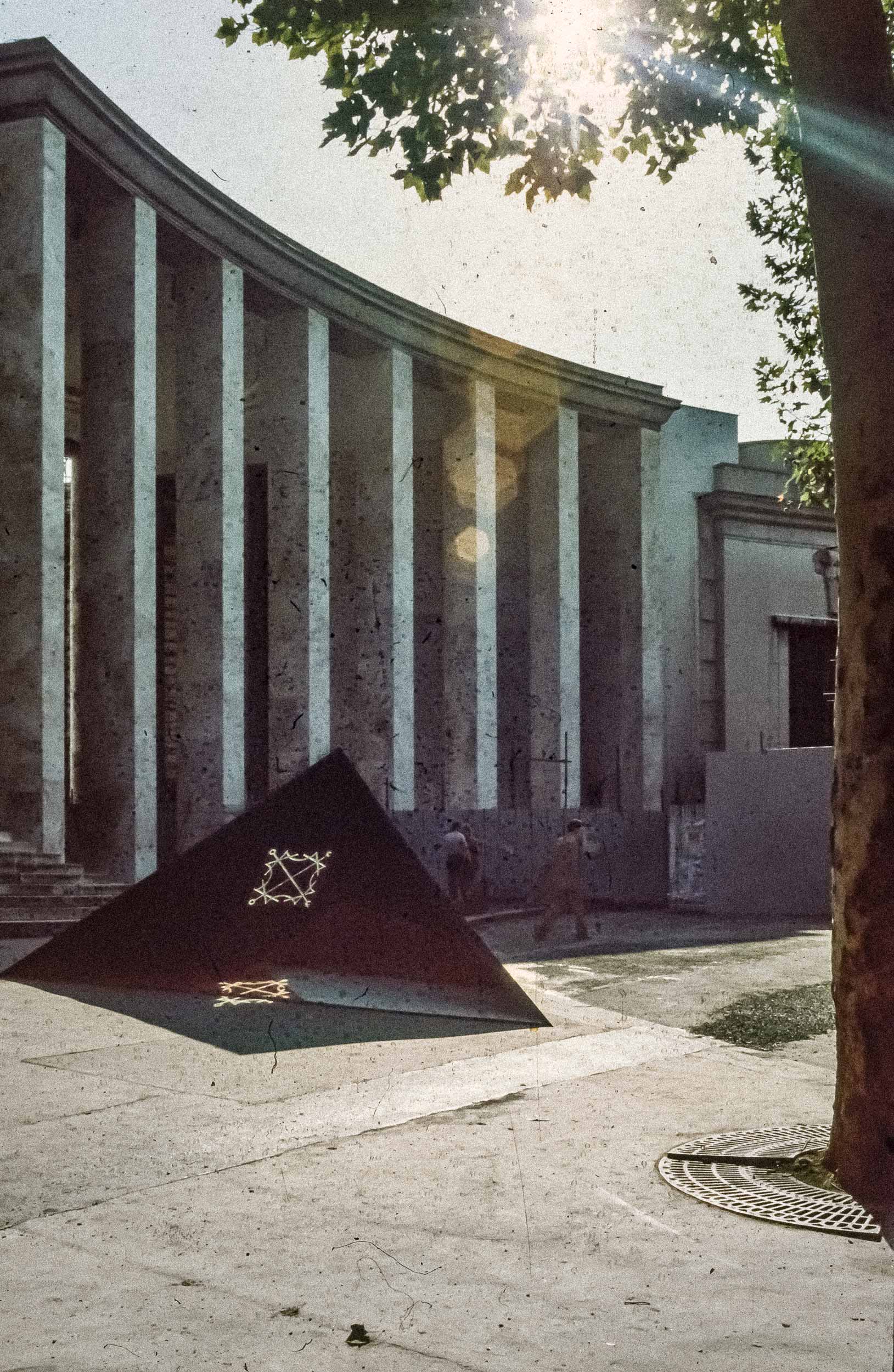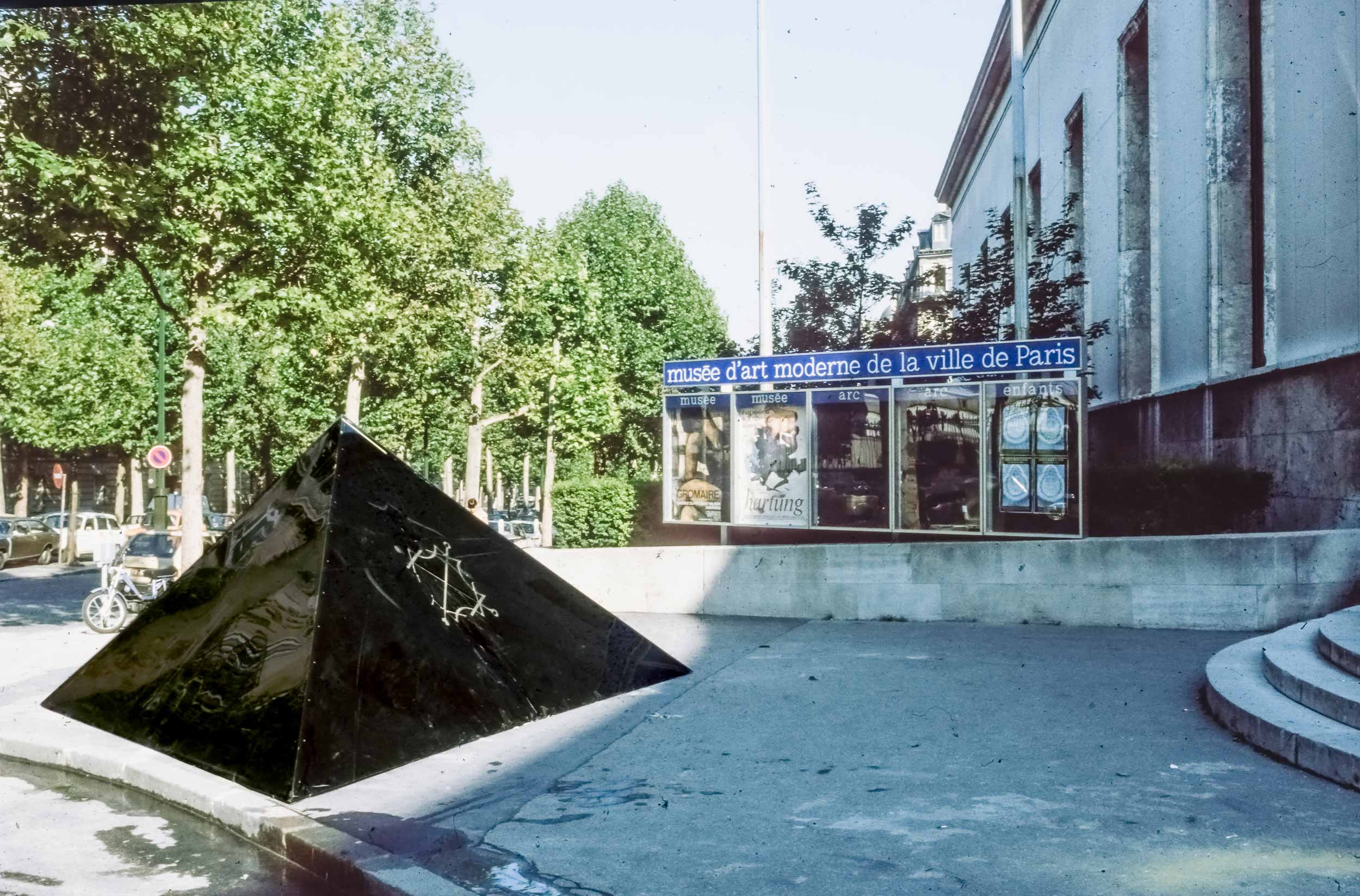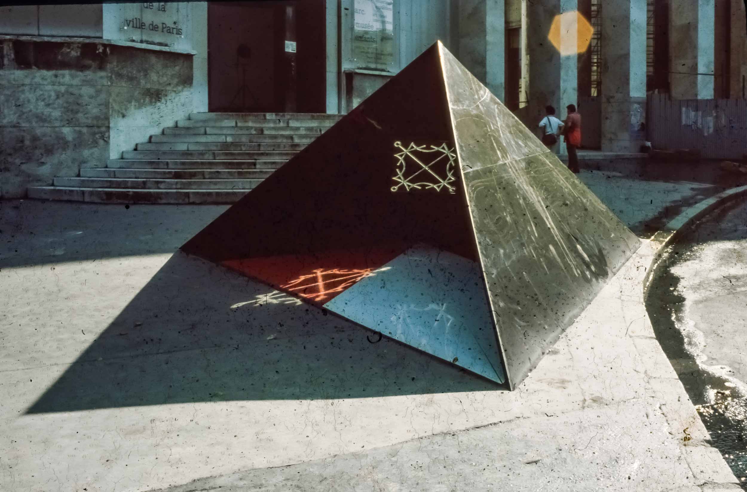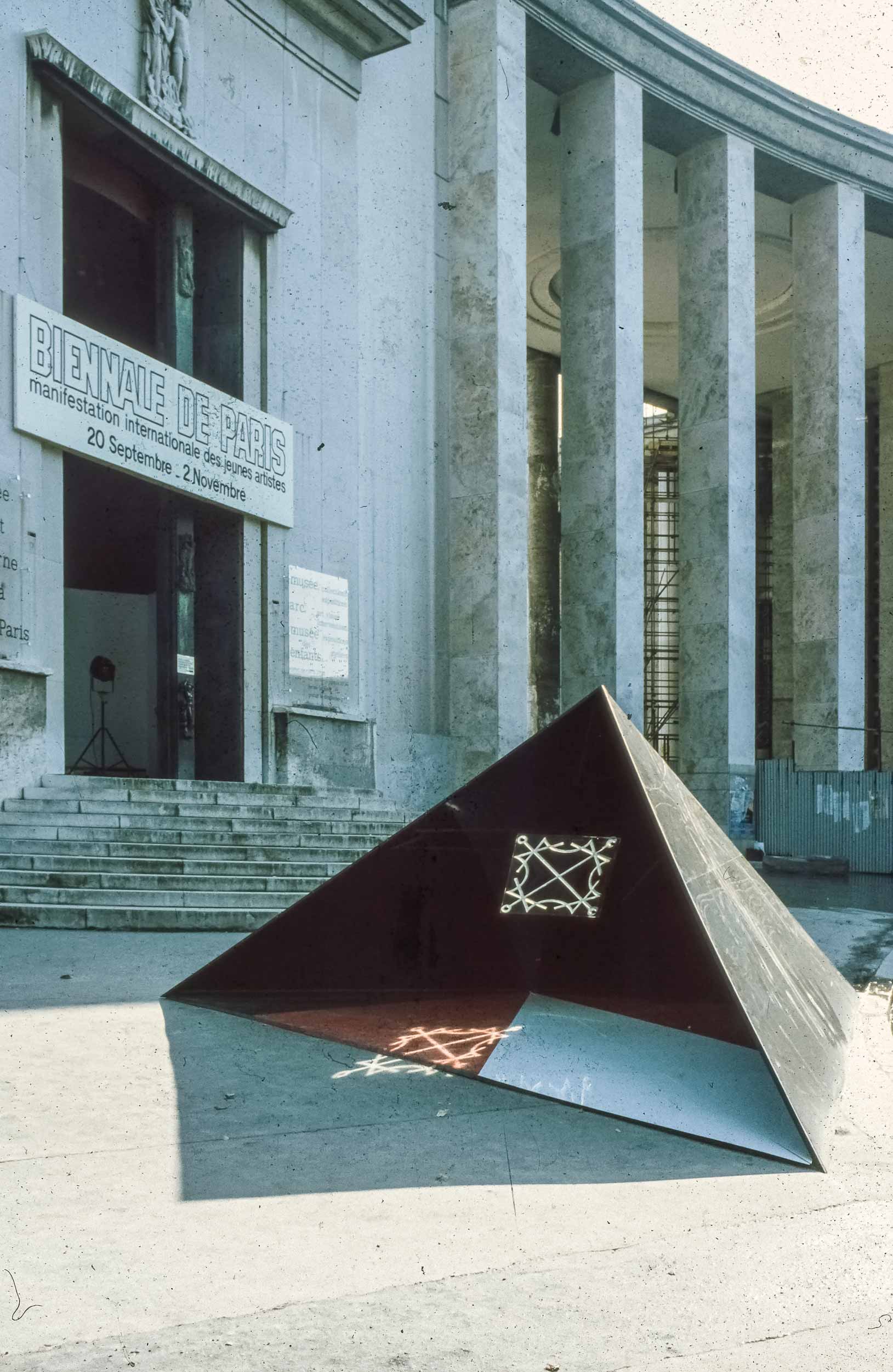 Sempre nel 1980, questa volta a gennaio, con il monumento di Venezia in corso di approvazione definitiva, fummo invitati a partecipare alla XI Biennale dei Giovani, che si sarebbe tenuta a Parigi nel settembre dello stesso anno. La struttura scelta fu quella della piramide, simbolo dell’anelito dell’uomo verso l’alto, verso il sole ed il divino. Il materiale usato, in luogo di cemento e marmo, fu il plexiglas: nera la piramide, nere, rosse e bianca le lastre orizzontali sulle quali scorreva il simbolo luminoso. Il simbolo scelto fu un Signaculum Solis basato su quadrati magici di numeri e lettere (dal De Occulta Philosophia di Enrico Cornelio Agrippa da Netteheim). La musica Il Preludio della Creazione di Haydn.