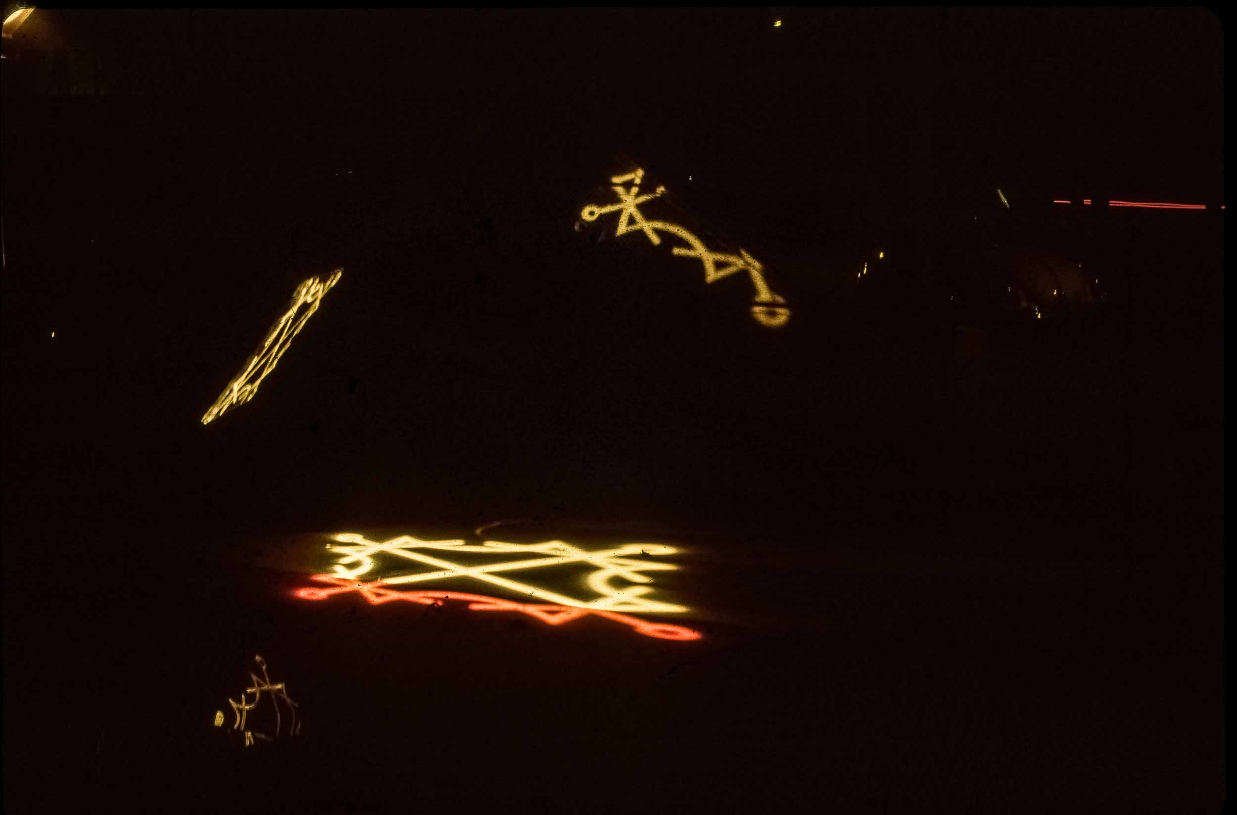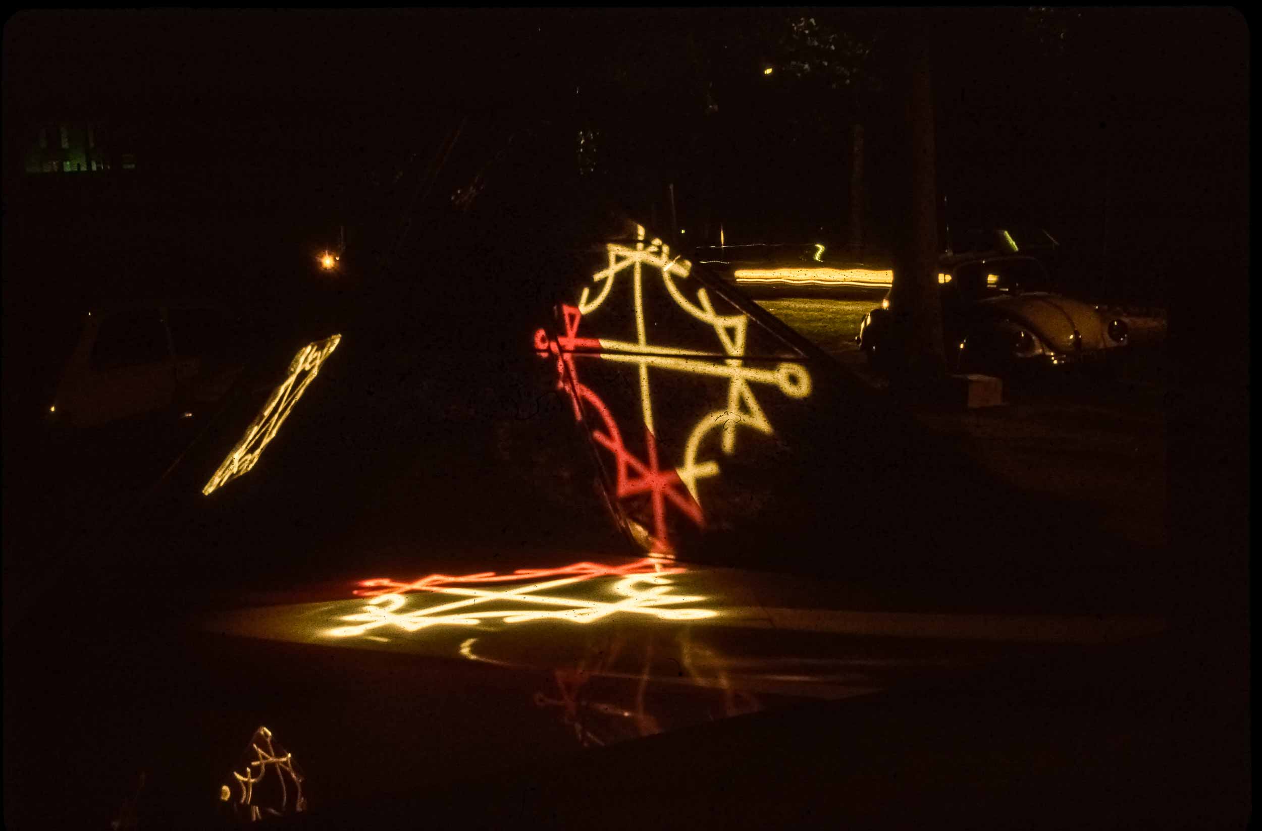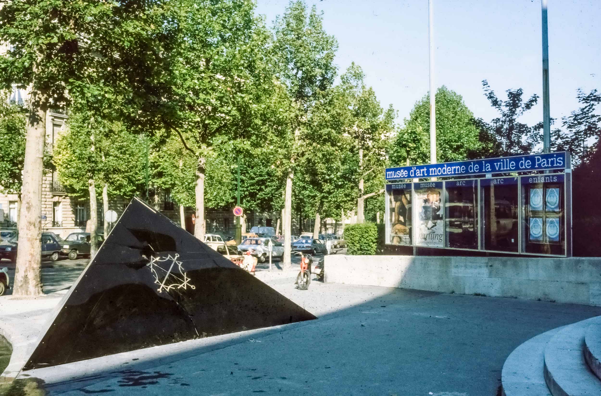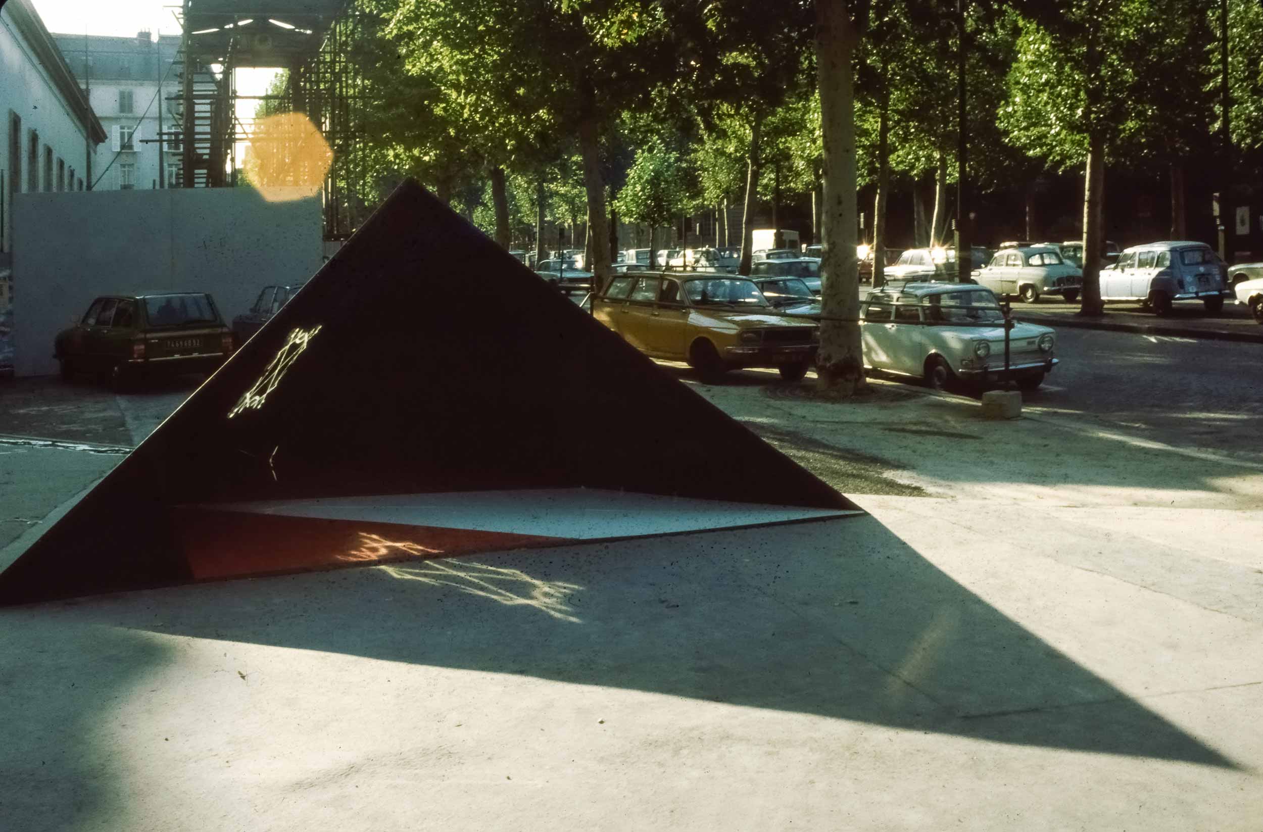 Sempre nel 1980, questa volta a gennaio, con il monumento di Venezia in corso di approvazione definitiva, fummo invitati a partecipare alla XI Biennale dei Giovani, che si sarebbe tenuta a Parigi nel settembre dello stesso anno. La struttura scelta fu quella della piramide, simbolo dell’anelito dell’uomo verso l’alto, verso il sole ed il divino. Il materiale usato, in luogo di cemento e marmo, fu il plexiglas: nera la piramide, nere, rosse e bianca le lastre orizzontali sulle quali scorreva il simbolo luminoso. Il simbolo scelto fu un Signaculum Solis basato su quadrati magici di numeri e lettere (dal De Occulta Philosophia di Enrico Cornelio Agrippa da Netteheim). La musica Il Preludio della Creazione di Haydn.