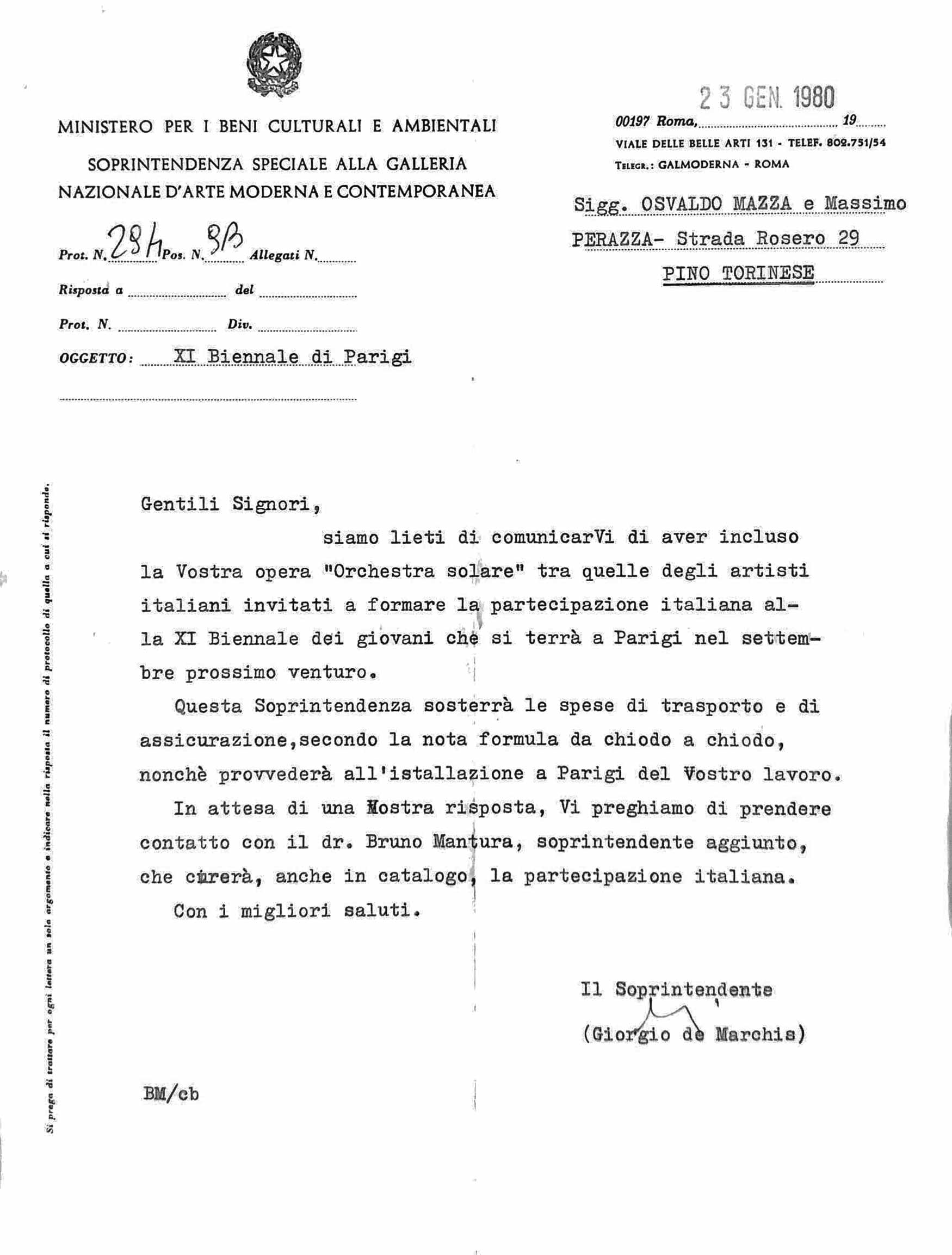 Osvaldo Mazza e Massimo Perazzo, i due giovani operatori airtistici torinesi si, che hanno realizzato nel contesto della Biennale Airti visive ’80 di Venezia, ai giairdi di Castello, l’Orchestra solare, della qualle abbiamo già dato notizia su questa pagina, hanno registrato un altro grande successo. La « Biennale de Paris » dedicata ai giovani ha chiesto loro una nuova « orahestra solare l», da collocare davanti all’ingresso della mostra: il Musée d’Art Moderne de la Ville de Paris.