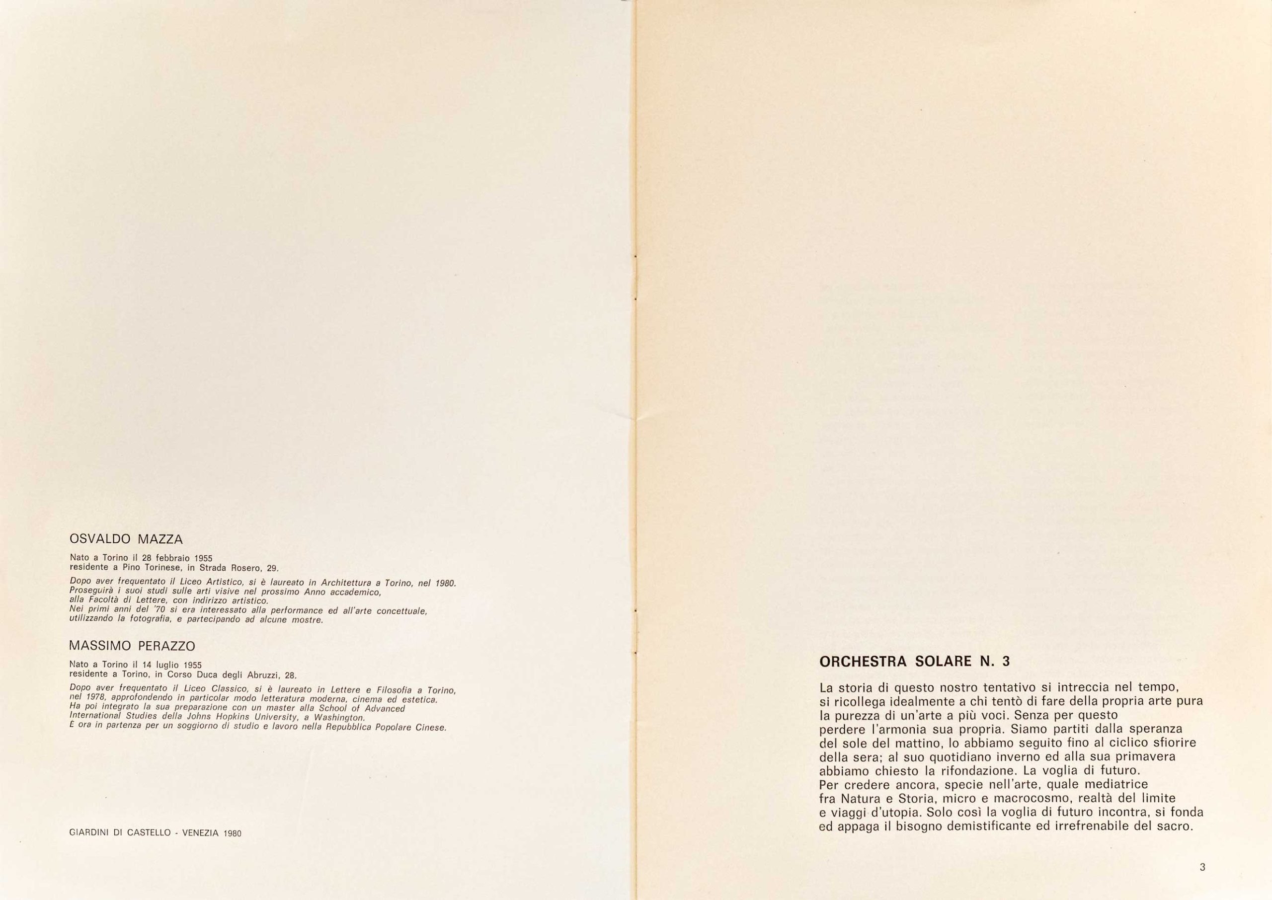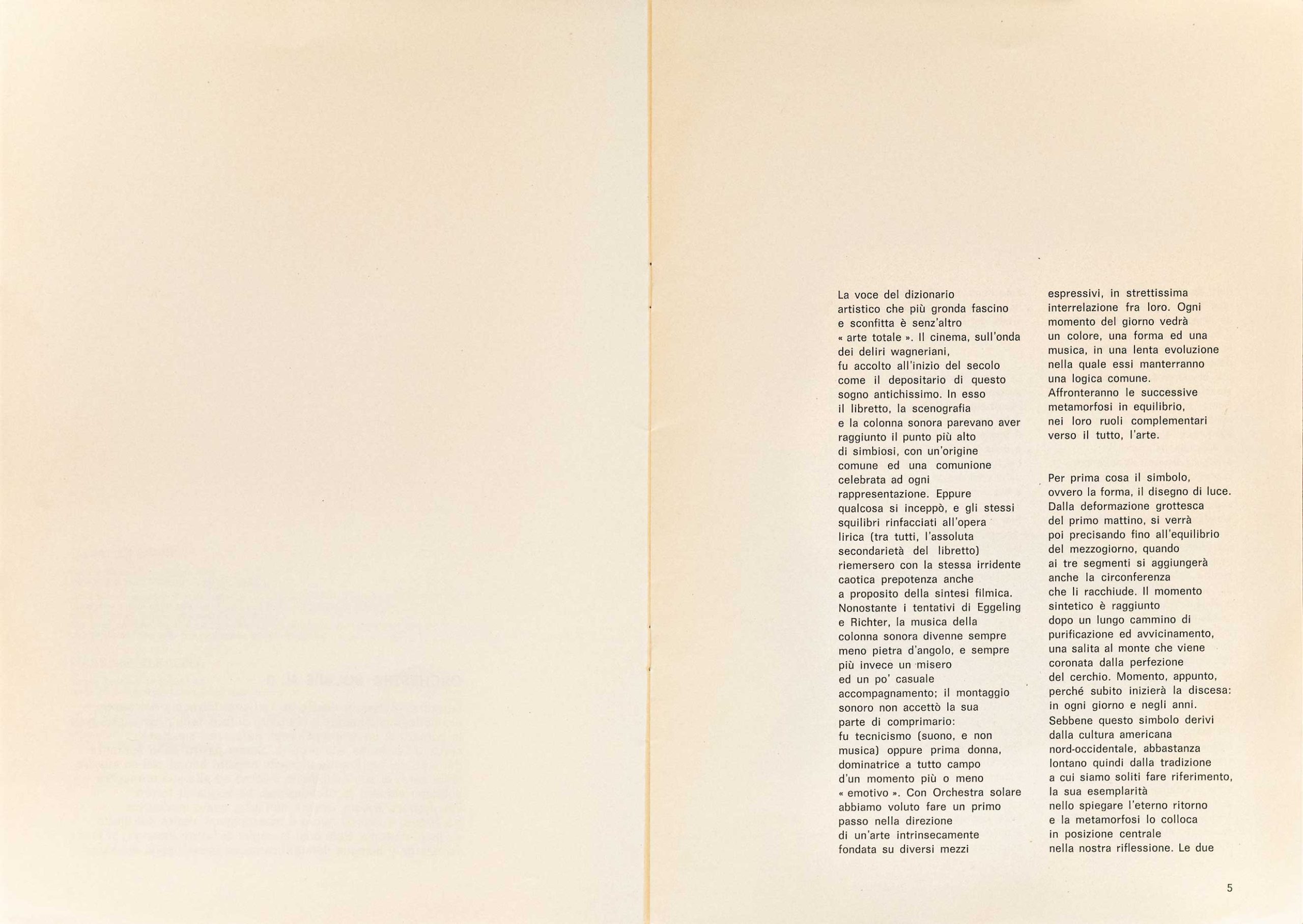 La voce del dizionario artistico che più gronda fascino e sconfitta è senz’altro arte totale. Il cinema, sull’onda dei deliri wagneriani, fu accolto all’inizio del secolo come il depositario di questo sogno antichissimo. In esso il libretto, la scenografia e la colonna sonora parevano aver raggiunto il punto più alto di simbiosi, con un’origine comune ed una comunione celebrata ad ogni rappresentazione. Eppure qualcosa si inceppò, e gli stessi squilibri rinfacciati all’opera lirica (tra tutti, l’assoluta secondarietà del libretto) riemersero con la stessa irridente caotica prepotenza anche a proposito della sintesi filmica. Nonostante i tentativi di Eggeling e Richter, la musica della colonna sonora divenne sempre meno pietra d’angolo, e sempre più invece un misero ed un po’ casuale accompagnamento; il montaggio sonoro non accettò la sua parte di comprimario: fu tecnicismo (suono, e non musica) oppure prima donna, dominatrice a tutto campo d’un momento più o meno «emotivo». Con Orchestra solare abbiamo voluto fare un primo passo nella direzione di un’arte intrinsecamente fondata su diversi mezzi espressivi, in strettissima interrelazione fra loro. Ogni momento del giorno vedrà un colore, una forma ed una musica, in una lenta evoluzione nella quale essi manterranno una logica comune. Affronteranno le successive metamorfosi in equilibrio, nei loro ruoli complementari verso ìl tutto, l’arte.