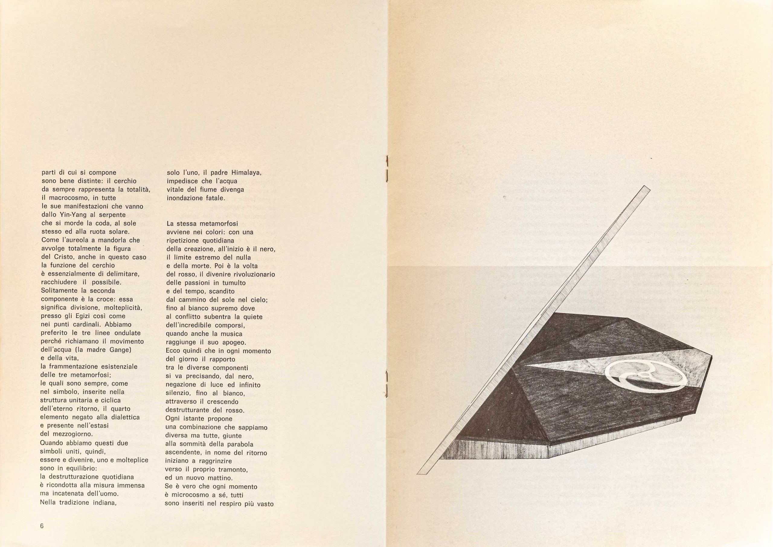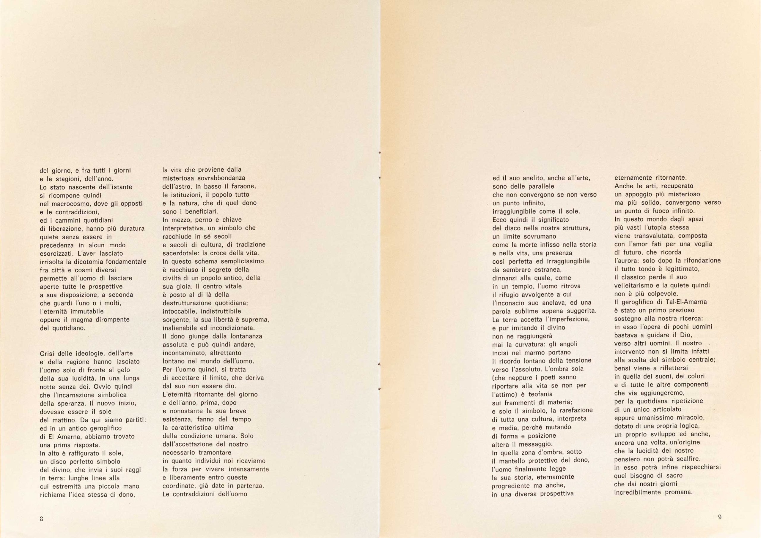 Anche le arti, recuperato un appoggio più misterioso ma più solido, convergono verso un punto di fuoco infinito. In questo mondo dagli spazi più vasti l’utopia stessa viene transvalutata, composta con l’amor fati per una voglia di futuro, che ricorda l’aurora: solo dopo la rifondazione il tutto tondo è legittimato, il classico perde il suo velleitarismo e la quiete quindi non è più colpevole. li geroglifico di Tal-EI-Amarna è stato un primo prezioso sostegno alla nostra ricerca: in esso l’opera di pochi uomini bastava a guidare il Dio, verso altri uomini. Il nostro intervento non si limita infatti alla scelta del simbolo centrale; bensì viene a riflettersi in quella dei suoni, dei colori e di tutte le altre componenti che via aggiungeremo, per la quotidiana ripetizione di un unico articolato eppure umanissimo miracolo, dotato di una propria logica, un proprio sviluppo ed anche, ancora una volta, un’origine che la lucidità del nostro pensiero non potrà scalfire. In esso potrà infine rispecchiarsi quel bisogno di sacro che dai nostri giorni incredibilmente promana.
