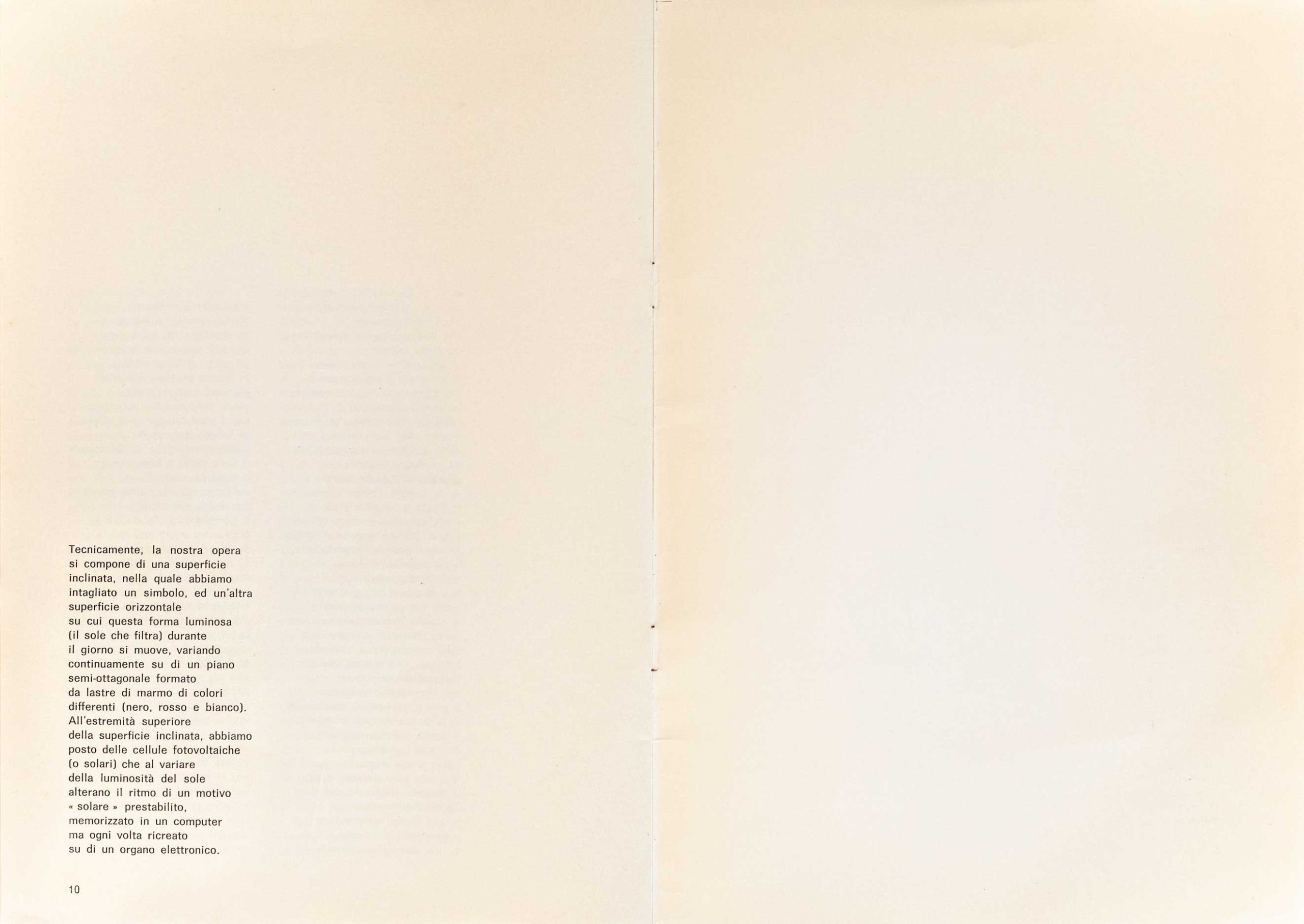 Tecnicamente, la nostra opera si compone di una superficie inclinata, nella quale abbiamo intagliato un simbolo, ed un’altra superficie orizzontale su cui questa forma luminosa (il sole che filtra) durante il giorno si muove, variando continuamente su di un piano semi-ottagonale formato da lastre di marmo di colori differenti (nero, rosso e bianco). All’estremità superiore della superficie inclinata, abbiamo posto delle cellule fotovoltaiche solari che al variare della luminosità del sale alterano il ritmo di un motivo «solare» prestabilito, memorizzato in un computer ma ogni volta ricreato su di un organo elettronico.