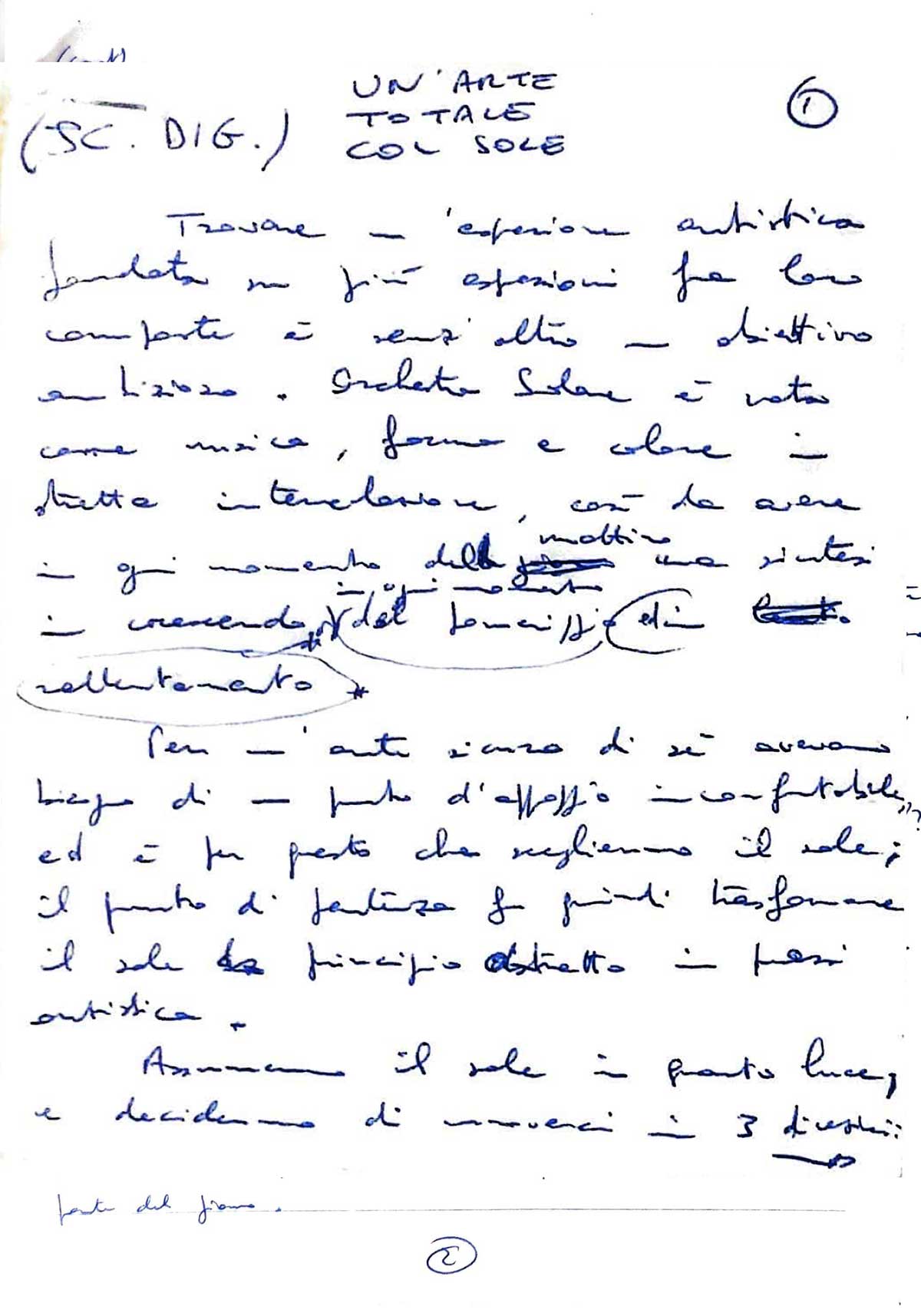 Chi si poneva di fronte ad Orchestra Solare coglieva immediatamente questo svolgersi congiunto delle 3 espressioni artistiche (la musica; la forma simbolica, come essenza della parola; i colori come essenza della arti visive) che durante il giorno sorgevano col sole, quando la musica era distorta, cosi come la forma luminosa, nel predominio del colore nero; per cominciare a muoversi col sole, sul rosso, insieme al crescendo della musica ed al definirsi progressivo della forma; per raggiungere il suo momento di perfezione a metà giornata, quando tutte e tre le espressioni artistiche raggiungevano il culmine, nel bianco, nella circolarità della forma, nell’apice del crescendo musicale. Poi iniziava la discesa nel pomeriggio, fino alla cessazione a sera, in attesa di una nuova aurora e di un nuovo inizio.